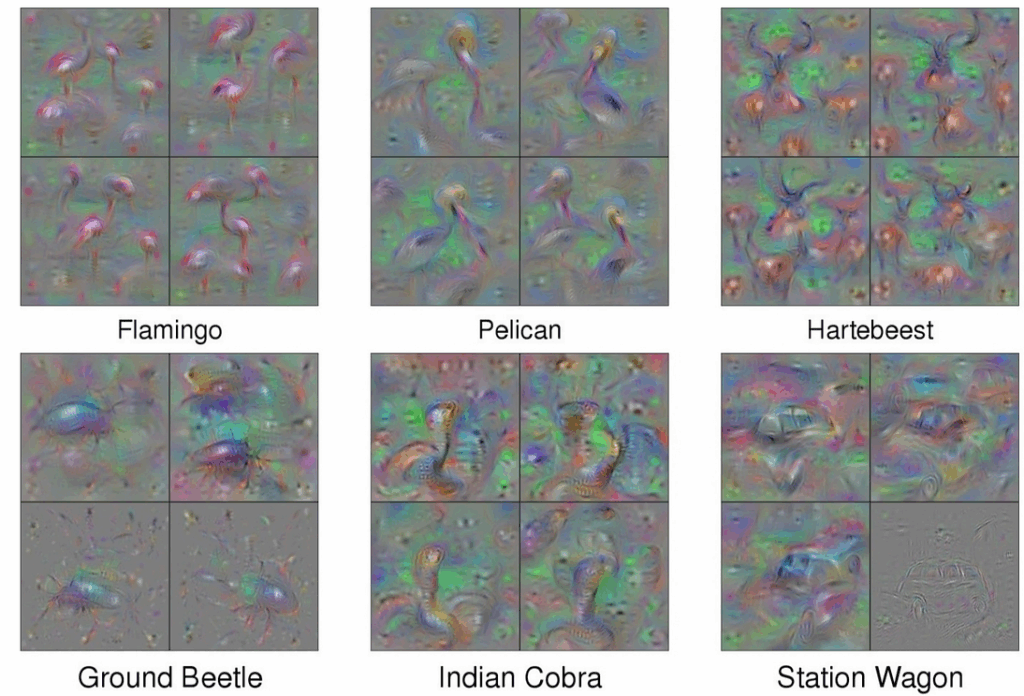 For interpretation, this idea was developed, e.g., in the work “Understanding Neural Networks Through Deep Visualization” (2015) by Jason Yosinski et al. The results look a lot like the famous “deep dreams”, and this is no coincidence; for example, here are the images designed to activate certain classes the most: