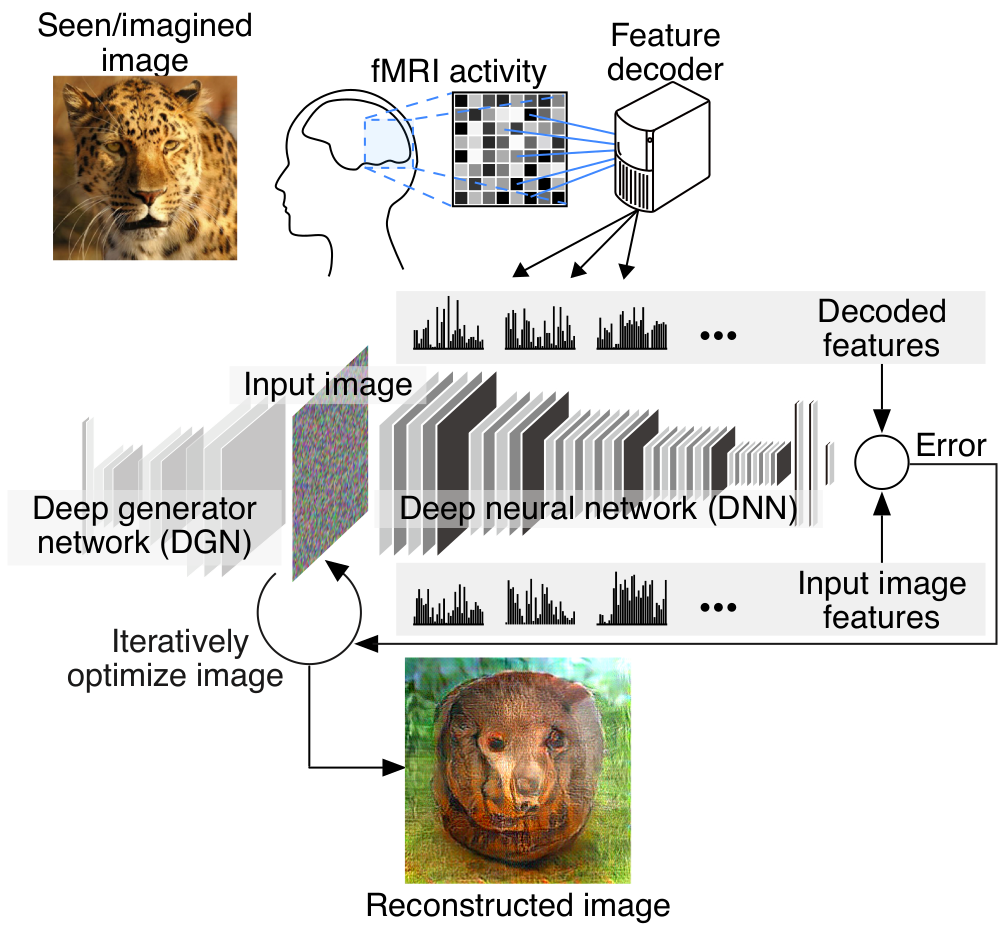 Shen et al.(2017) tried to reconstruct the exact images that people in fMRI scanners were looking at. To do that, they trained a deep neural network on fMRI activity results and then tried to match the features of a new image with the features of fMRI activations. That is, they are basically doing the same thing that we discussed above: finding an input image that matches given features as well as possible. The only difference is that the features now come not from a real image processed by the CNN but from an fMRI processed by a different network (also convolutional, of course). You can see how the network gradually fits the image to a given fMRI pattern:
