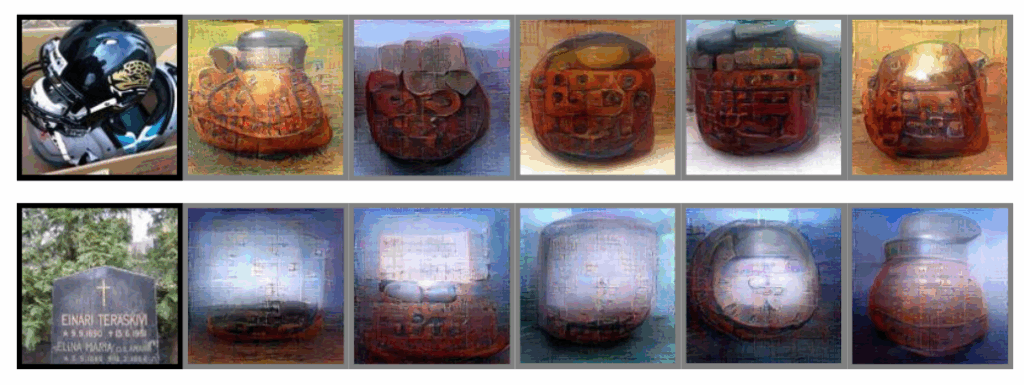 These examples, by the way, show that modern convolutional neural networks still have a long way to go before solving computer vision once and for all: although we all know some optical illusions that work for humans, there are no adversarial examples that would make us recognize a two-dimensional picture of a bottlecap as a toy poodle. But the power to fit images to features in the network can also be used for good. Let us see how.